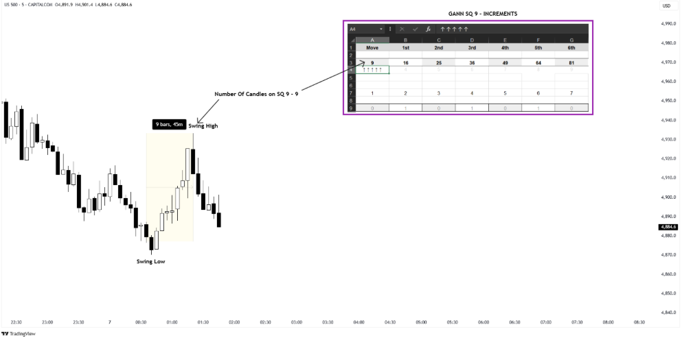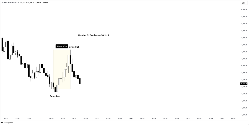 From the chosen swing low to the swing high, the market took 9 bars to complete the move. That number isn’t just a count—it becomes our anchor in time.