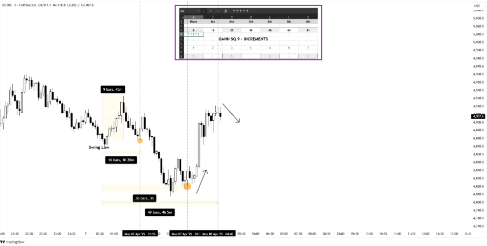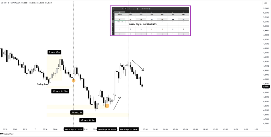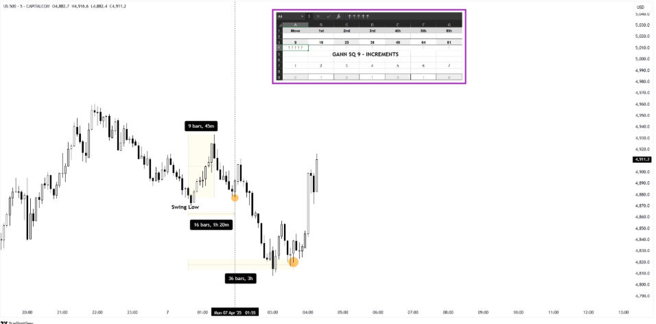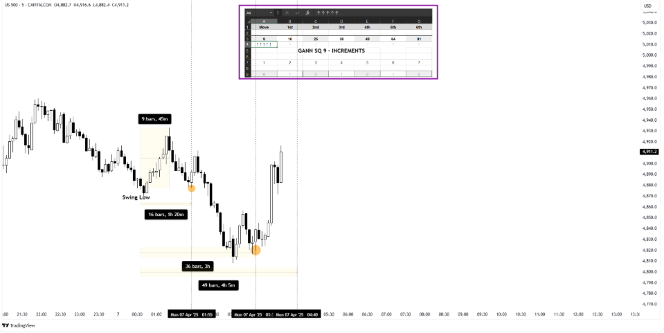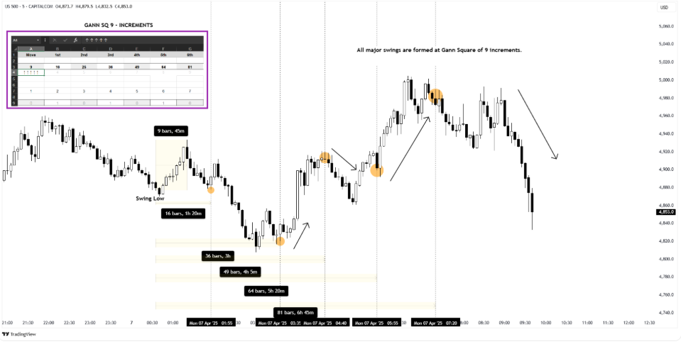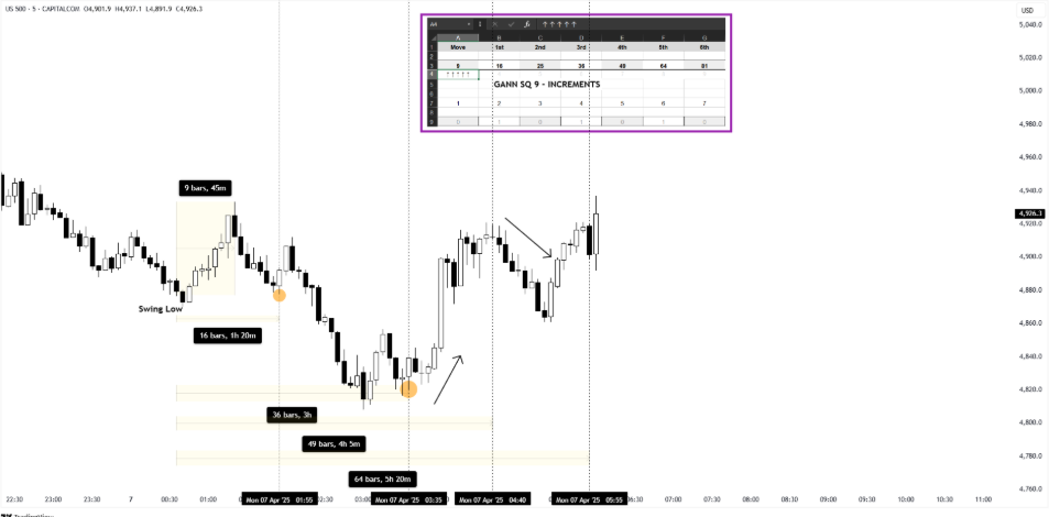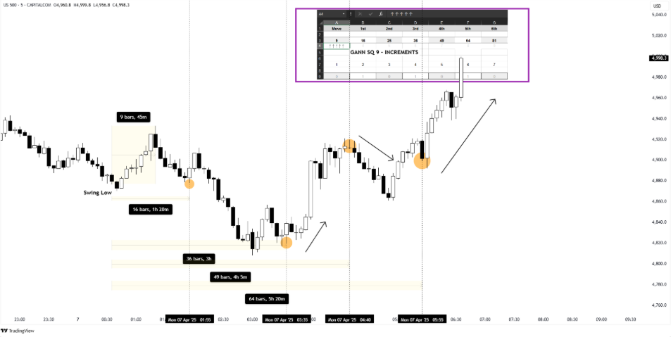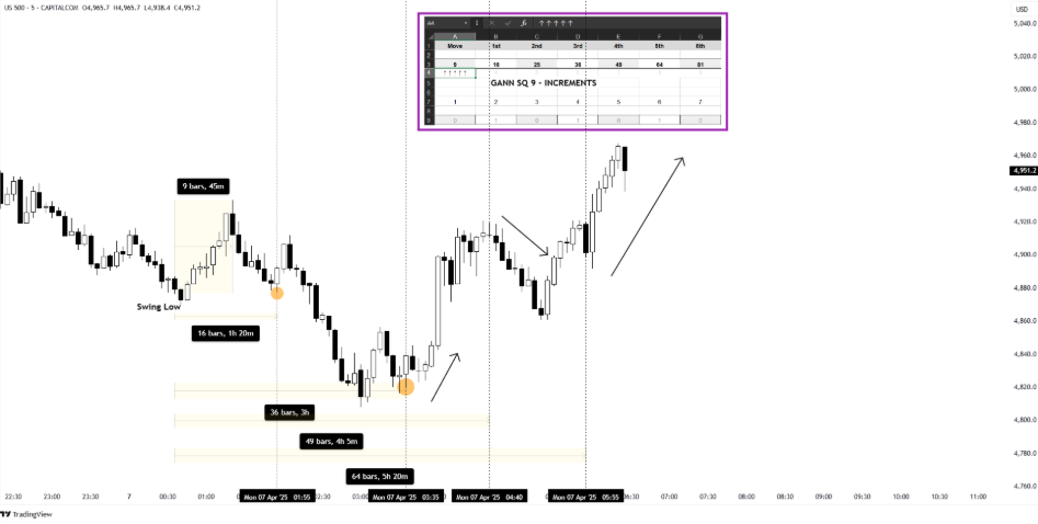 That’s exactly what W.D. Gann mastered. His tools, like the Square of 9, weren’t just about charts, they were about timing the rhythm of the market. Today, I’ll walk you through a real-world example on the US500, using Gann’s time technique on the 5-minute chart. This isn’t theory. This is how you can bring Gann’s legacy to life in real-time trading.